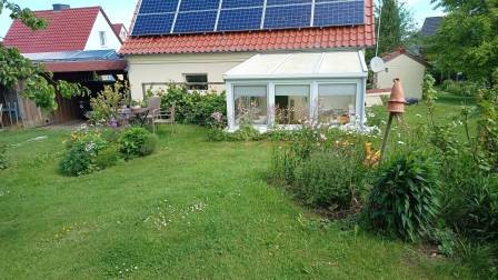 Der Ferienwohnung vorgelagert ist ein etwa 11 m² großer Wintergarten, von dem aus Sie in alle Richtungen in unseren hinteren Gartenteil mit alten Obstbäumen und neu angelegten Blumenbeeten schauen. Sie sitzen förmlich im Grünen. Ausgestattet mit Esstisch und zwei bequemen Rattansesseln eignet sich der Wintergarten ebenso zum Frühstücken.
